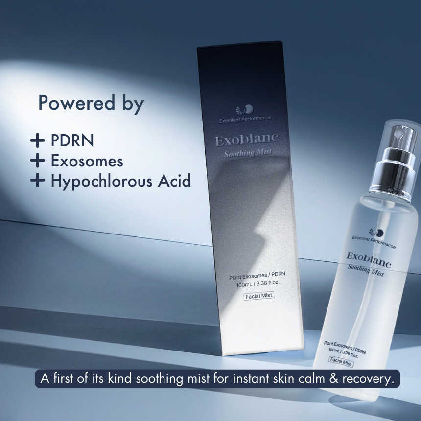 The Exoblanc Soothing Mist combines Exosome technology, PDRN, and Hypochlorous Acid to calm, repair, and protect the skin on a cellular level. Exosomes act as intelligent messengers, delivering renewal signals that enhance barrier strength and resilience. PDRN, a marine-derived DNA fragment, supports collagen production and accelerates natural healing for smoother, firmer skin. Meanwhile, Hypochlorous Acid purifies and soothes inflammation, creating the perfect balance between hydration, clarity, and calm.